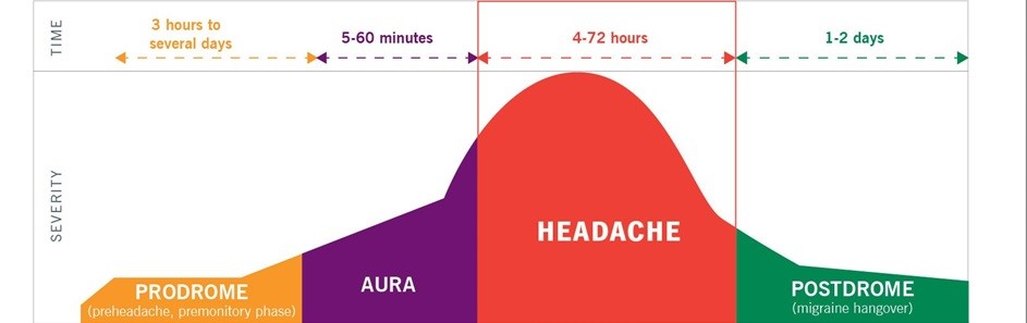 De fyra stadierna i kronologisk ordning är prodromen (pre-monitoring), aura, huvudvärk och postdrome. Cirka 30 % av människor upplever symtom innan deras huvudvärk börjar.